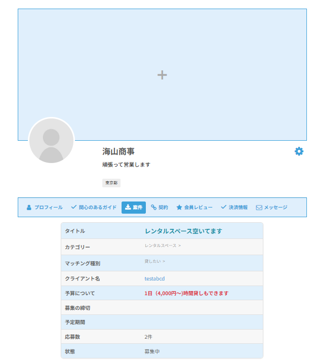 サイト内での第一印象を左右する大切な場所ですので、丁寧な作り込みをおすすめします。特に画像がないと看板のないお店のような印象になってしまうため、ヘッダーやプロフィール画像は忘れずに設定しましょう。項目が埋まっているほうが信頼感が増し、マッチングにもプラスに働きます。